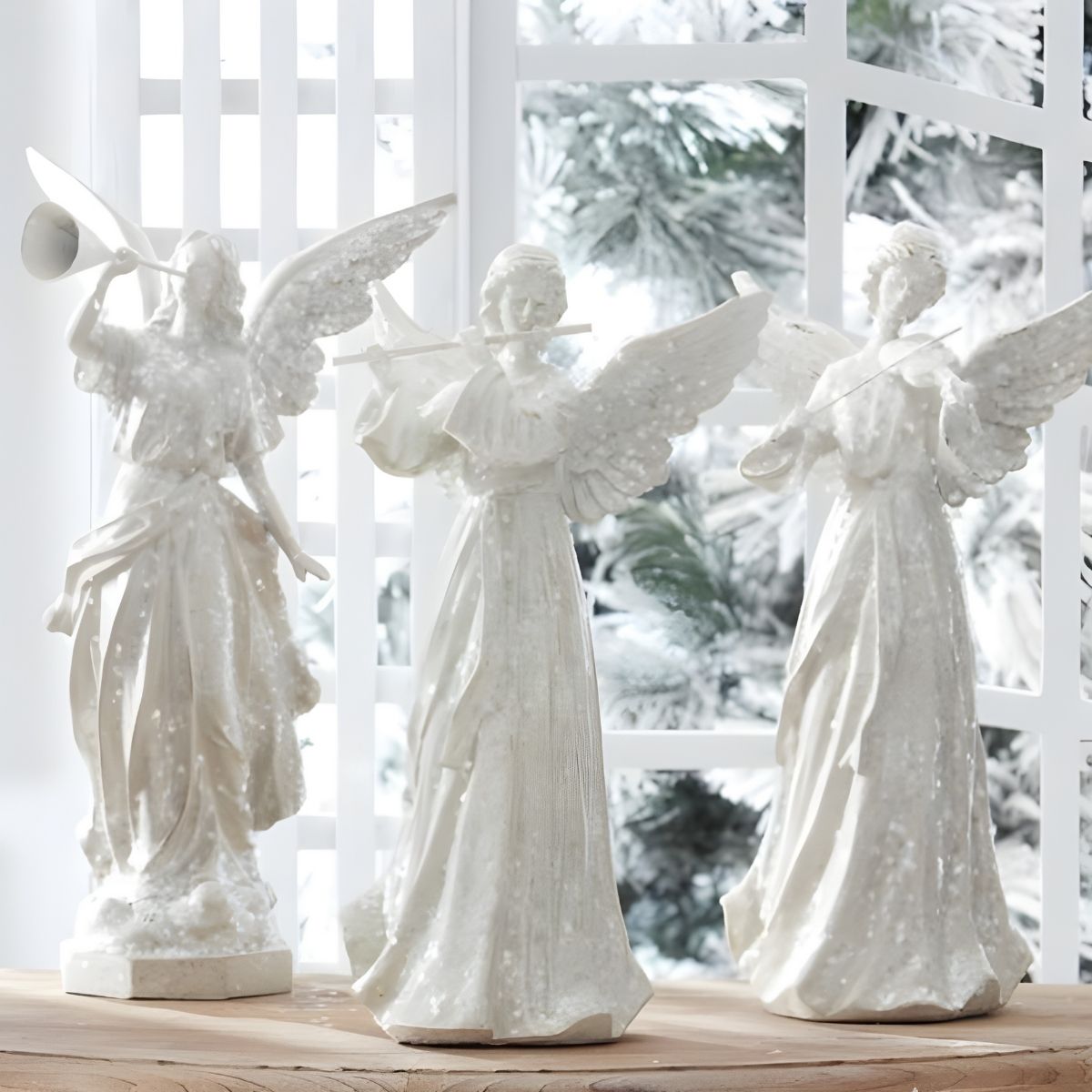 Este set de tres figuras de ángeles aporta un toque de gracia y brillo clásico a su decoración navideña. Cada ángel está finamente esculpido en resina y presenta una pose distinta. Las figuras están cubiertas con una capa de purpurina (glitter) blanca sobre un acabado pálido, dándoles una apariencia etérea, nevada y radiante. Su tamaño y diseño detallado las hacen perfectas para exhibir en un manto, estantería o como parte de un pesebre o centro de mesa festivo.Características: -El set incluye tres figuras de ángeles con poses instrumentales variadas- Las tres piezas son del mismo tamaño, midiendo aproximadamente 36.83 cm de alto por 20.32 cm de ancho y 10.16 cm de profundidad (14.5" H x 8" W x 4" D)- El material principal es la resina.
