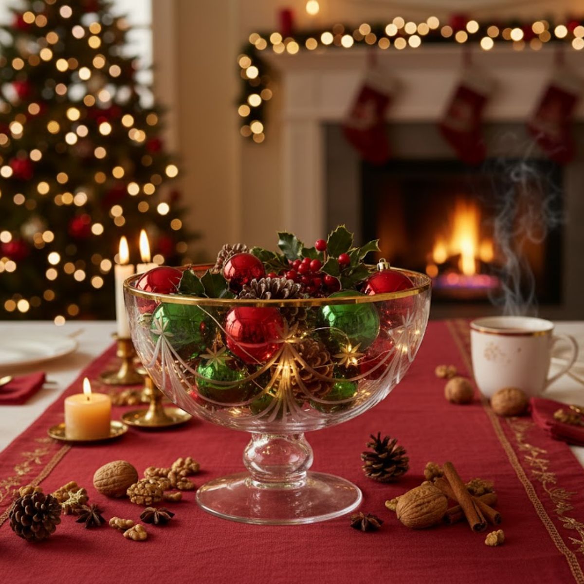 - Acabado transparente con detalles tallados (estrellas y guirnaldas).