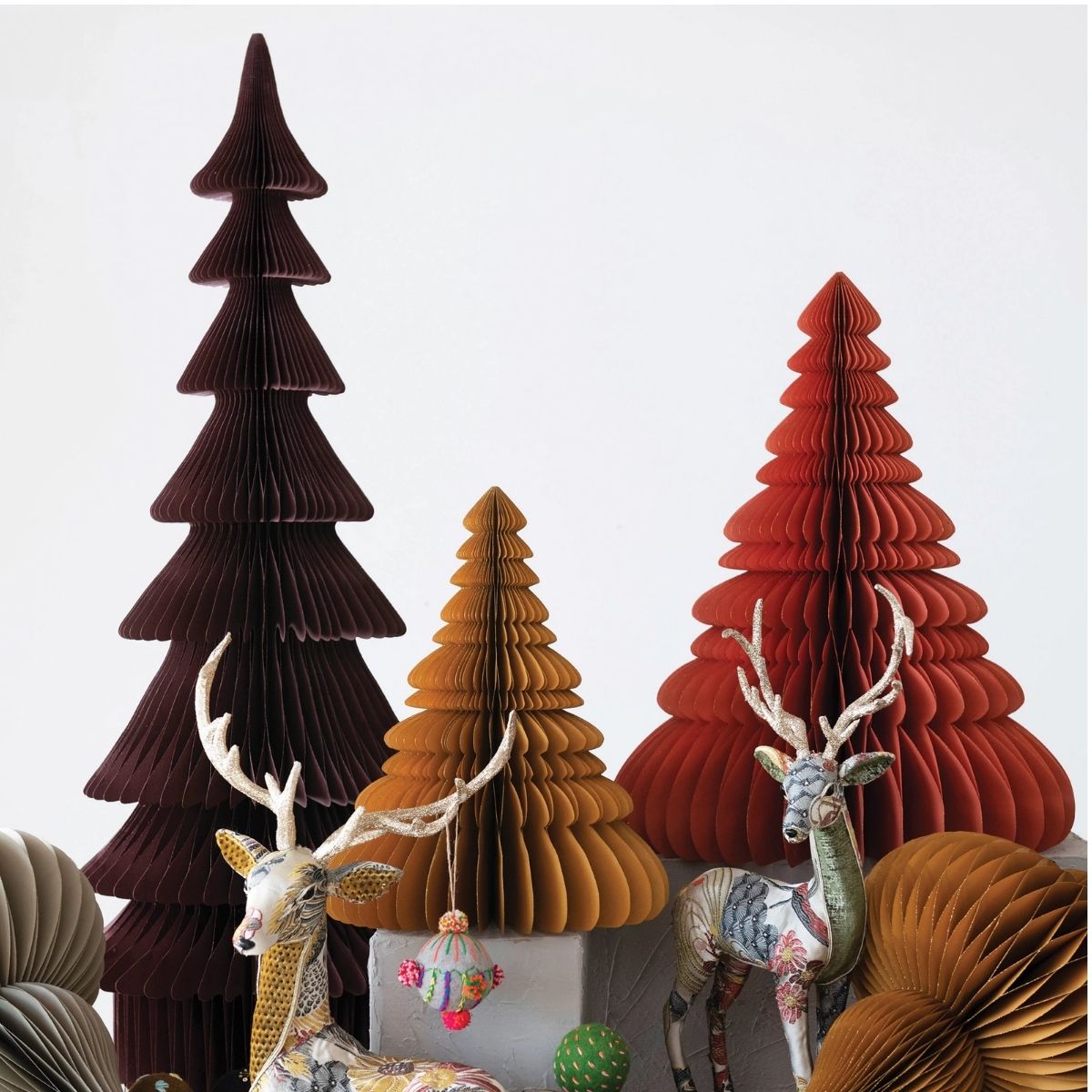 Cree un impacto visual impresionante con este árbol decorativo de papel. Con una altura monumental de 48 pulgadas (121.92 cm), esta pieza está hecha a mano con papel reciclado en un diseño plegable tipo "nido de abeja" (honeycomb). Su color marrón y gran tamaño lo convierten en un punto focal moderno y ecológico para cualquier decoración de temporada.