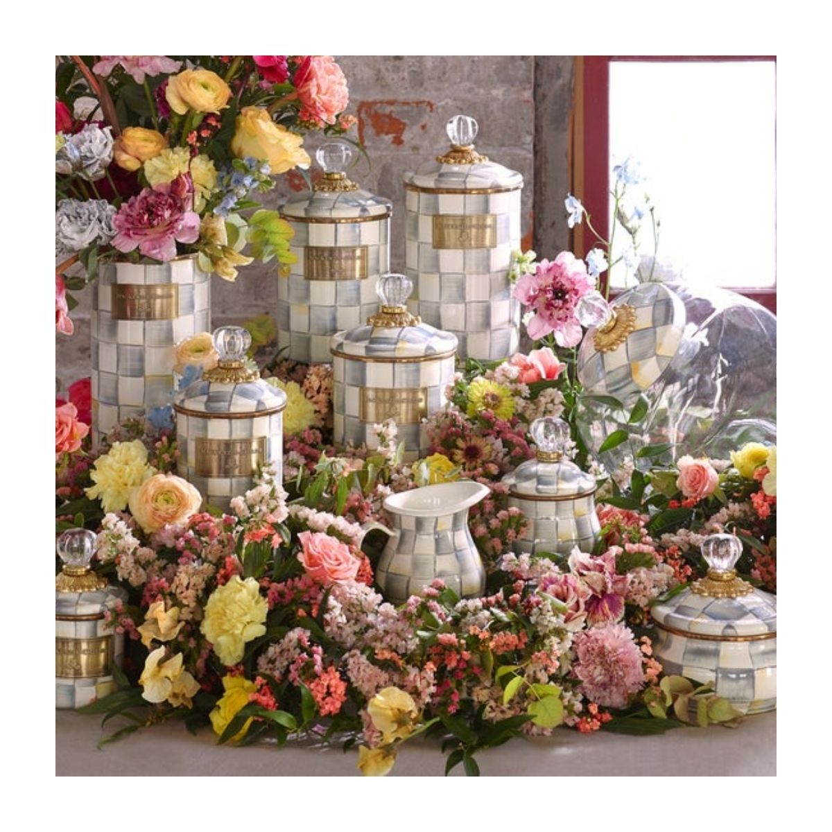 Una joya compacta con encanto sofisticado. Este mini canister en acero esmaltado presenta el icónico patrón Sterling Check en tonos gris plateado y blanco, pintado a mano. Su tapa con pomo de vidrio transparente y el borde metálico bronceado le dan presencia y elegancia incluso en espacios pequeños.