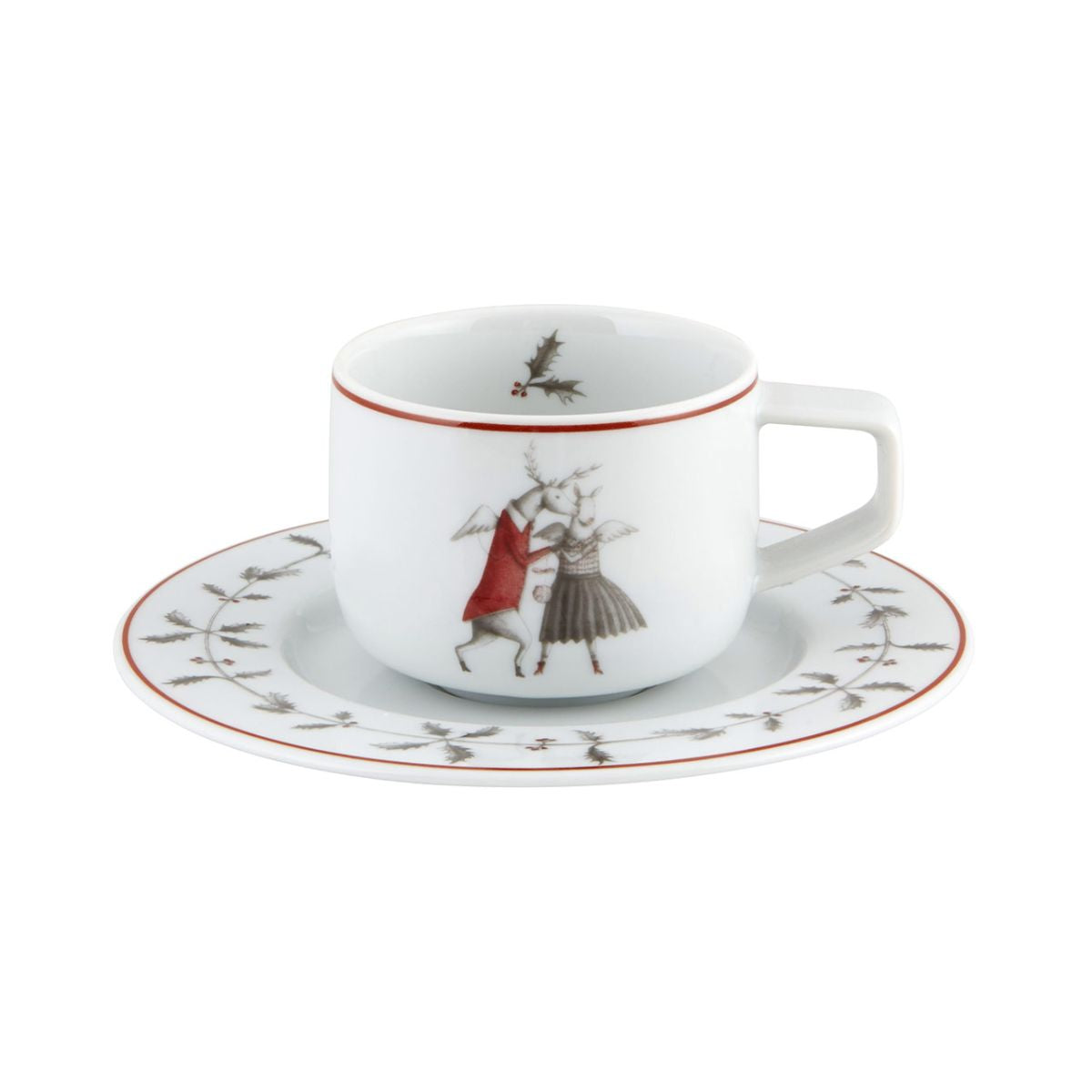 Disfrute de su café con esta encantadora taza y platillo de la colección Nöel. Diseñada por Teresa Lima para Vista Alegre, esta pieza de porcelana captura el espíritu navideño de unión. La taza y el platillo están decorados con las ilustraciones de un reno y un conejo listos para bailar (To Dance), simbolizando el amor universal.