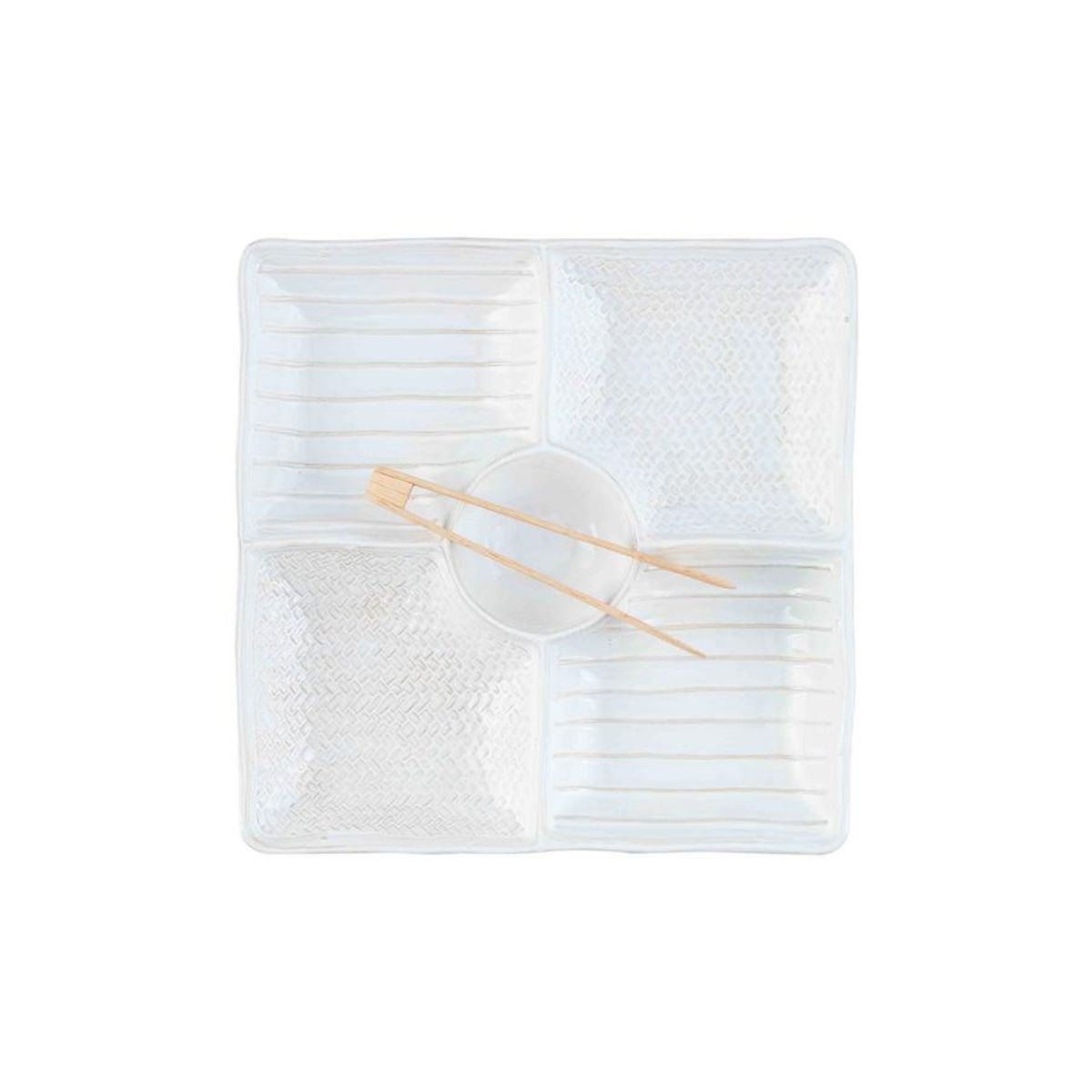 Este set de dos piezas de Mud Pie es ideal para servir aperitivos y salsas. El plato está fabricada en gres con un acabado de esmalte reactivo, que le da una superficie texturizada. El plato cuenta con cuatro secciones divididas y un espacio central para salsas, lo que lo hace perfecto para presentar una variedad de alimentos. El set incluye unas pinzas de madera para servir. La bandeja mide 29.2 cm x 29.2 cm y las pinzas miden 17.8 cm de largo.
