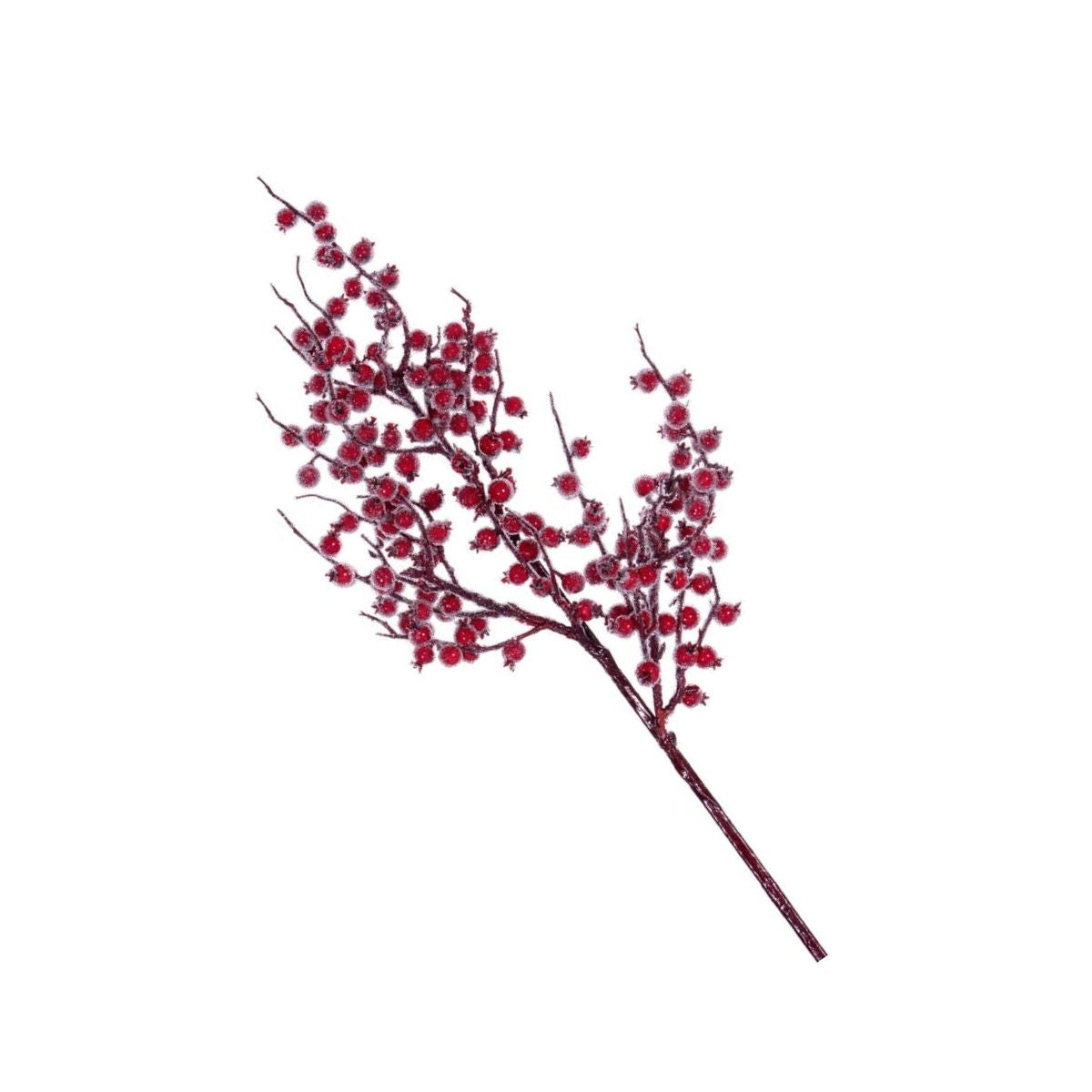 - Bayas rojas vibrantes con un acabado que simula hielo o escarcha.