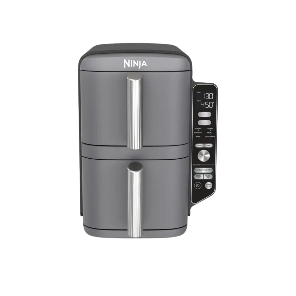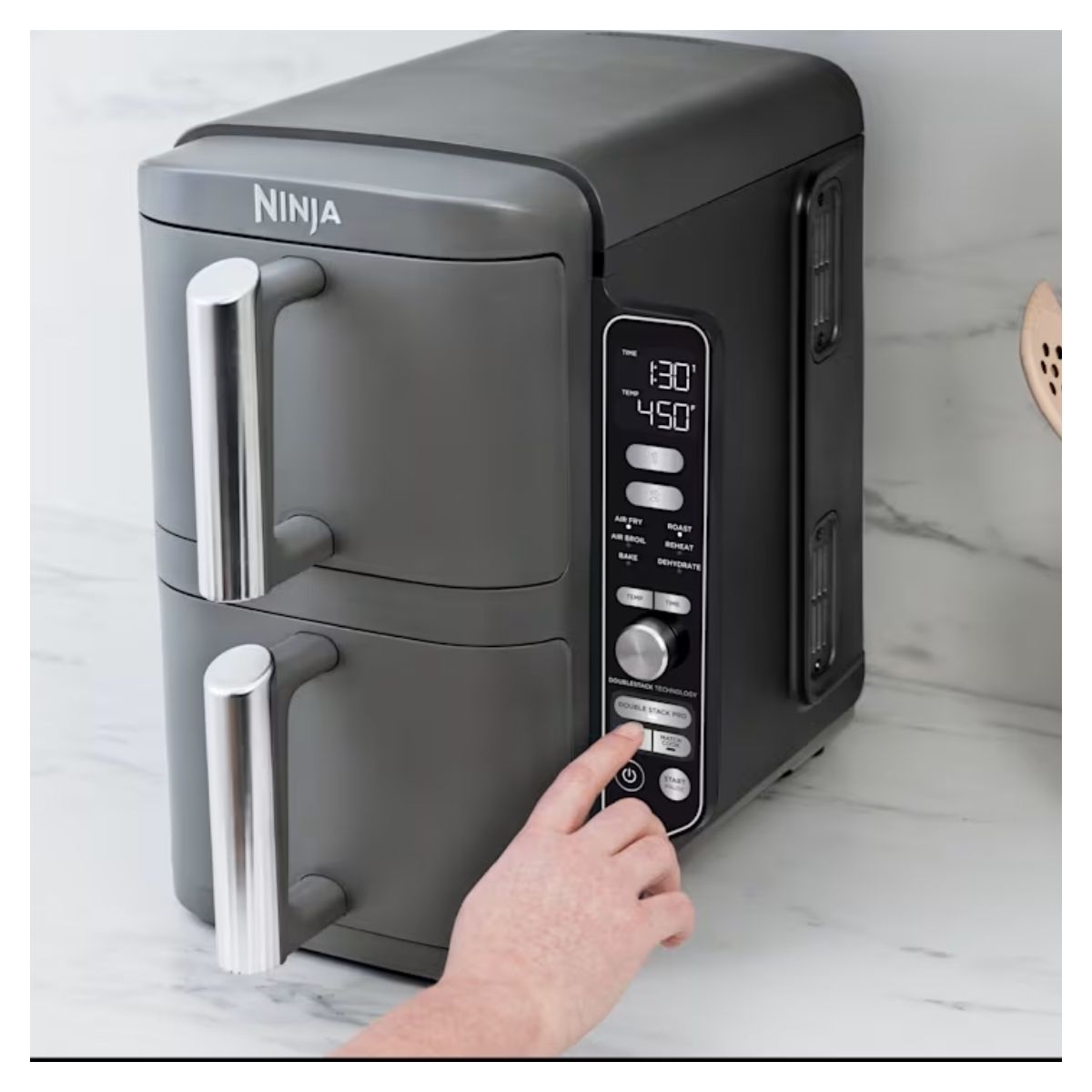 Su diseño vertical apila dos canastas para cocinar hasta 4 alimentos a la vez, dándote la capacidad de dos freidoras en el espacio de una. Con una capacidad total de 9.4 litros, es perfecta para comidas familiares, permitiendo cocinar dos pollos de 2.2 kg al mismo tiempo. Sus 6 funciones de cocción incluyen Freír con Aire, Asar, Hornear, Rostizar, Recalentar y Deshidratar. Las tecnologías Smart Finish y Match Cook sincronizan la cocción para que todo esté listo al mismo tiempo. Sus dimensiones son 28.6 cm de largo, 48.8 cm de ancho y 38.5 cm de alto, con un peso de 23.2 lb.