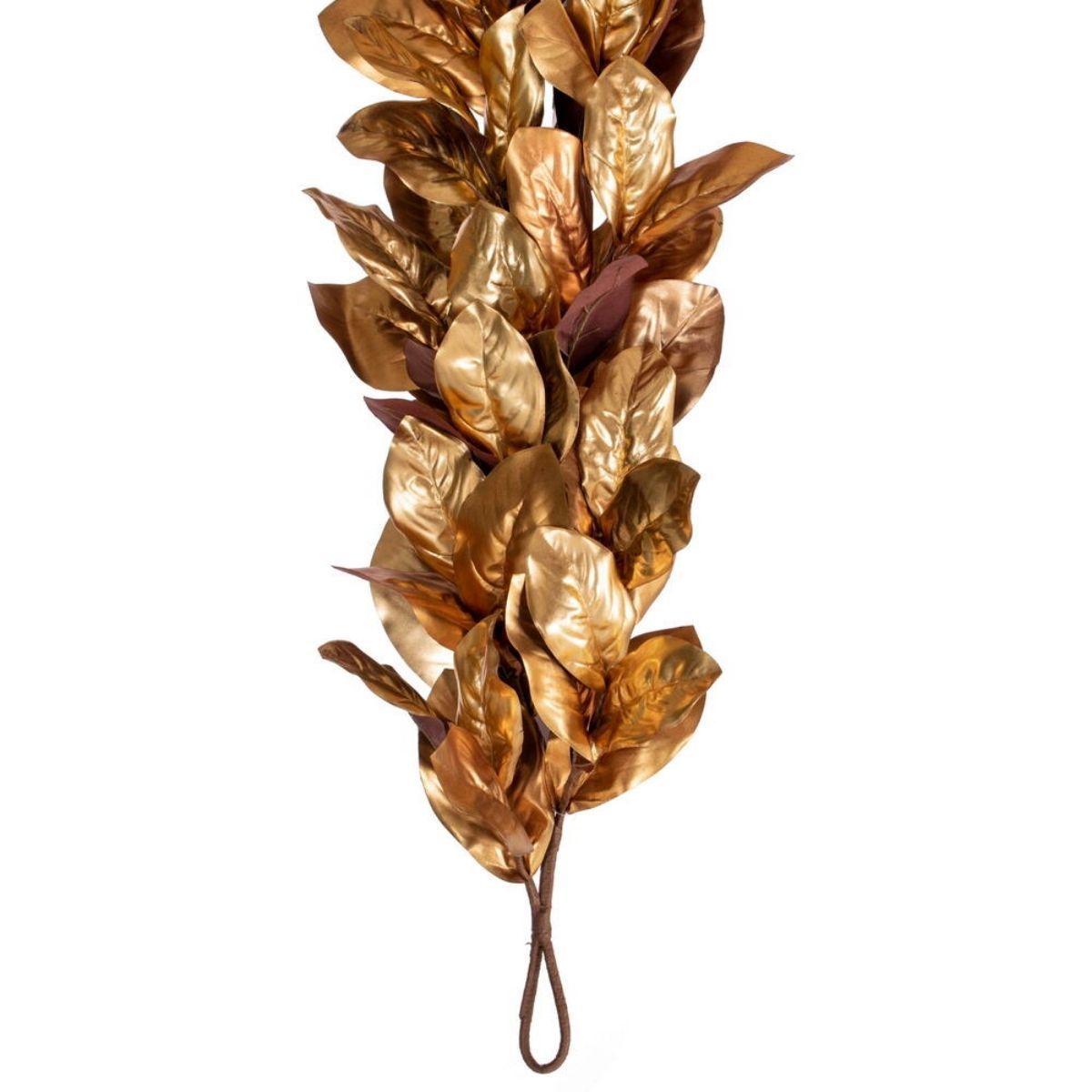Envuelva sus espacios con un toque de lujo utilizando esta guirnalda de hojas de magnolia de 6 pies. Sus hojas realistas presentan un deslumbrante acabado dorado metálico, aportando brillo y sofisticación. Ideal para decorar repisas, barandillas, marcos de puertas o como camino de mesa durante las fiestas o eventos especiales durante todo el año.
