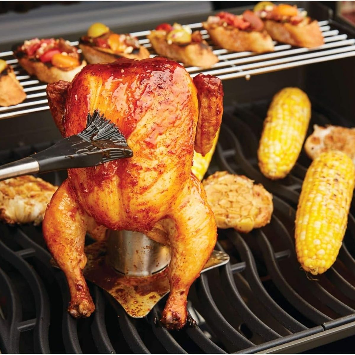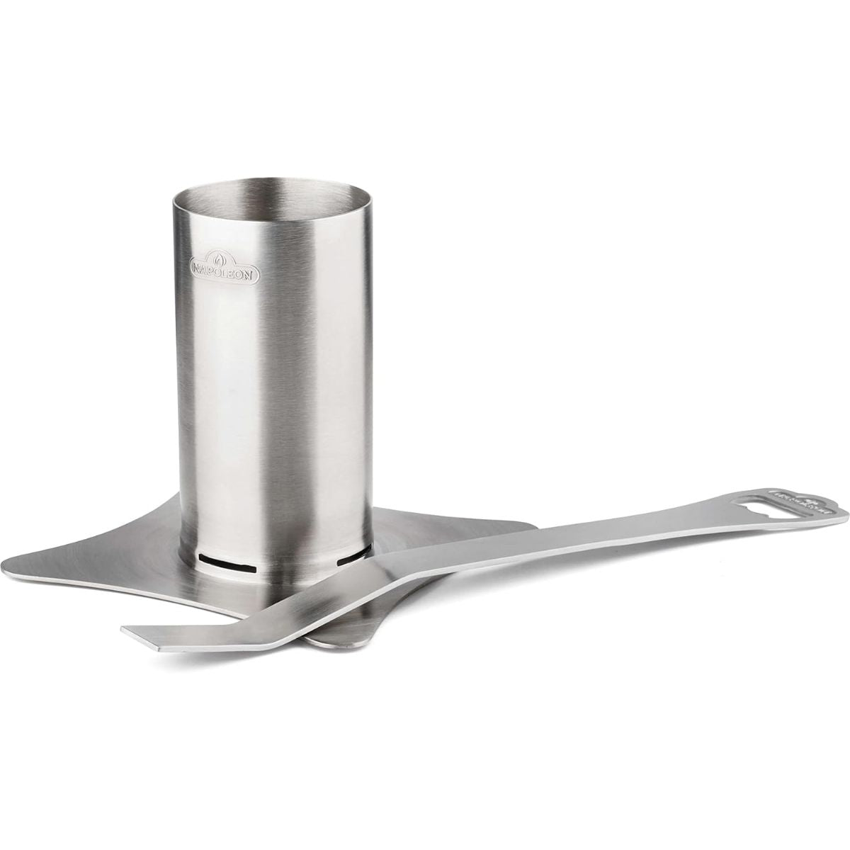 El asador de pollo de acero inoxidable de Napoleon es el accesorio definitivo para obtener un pollo increíblemente jugoso y lleno de sabor con el método de "infusión de vapor". Posee un recipiente central con capacidad de 250 ml (1 taza) diseñado para llenarse con cerveza, vino, jugos o caldos con hierbas aromáticas, los cuales hidratan la carne desde el interior mientras la piel se vuelve crujiente por fuera. Su diseño compacto maximiza el espacio disponible en la parrilla, permitiendo cocinar guarniciones simultáneamente. Además, incluye una innovadora manija extraíble que facilita el traslado seguro del ave de la barbacoa a la mesa, evitando quemaduras y proporcionando un manejo profesional.