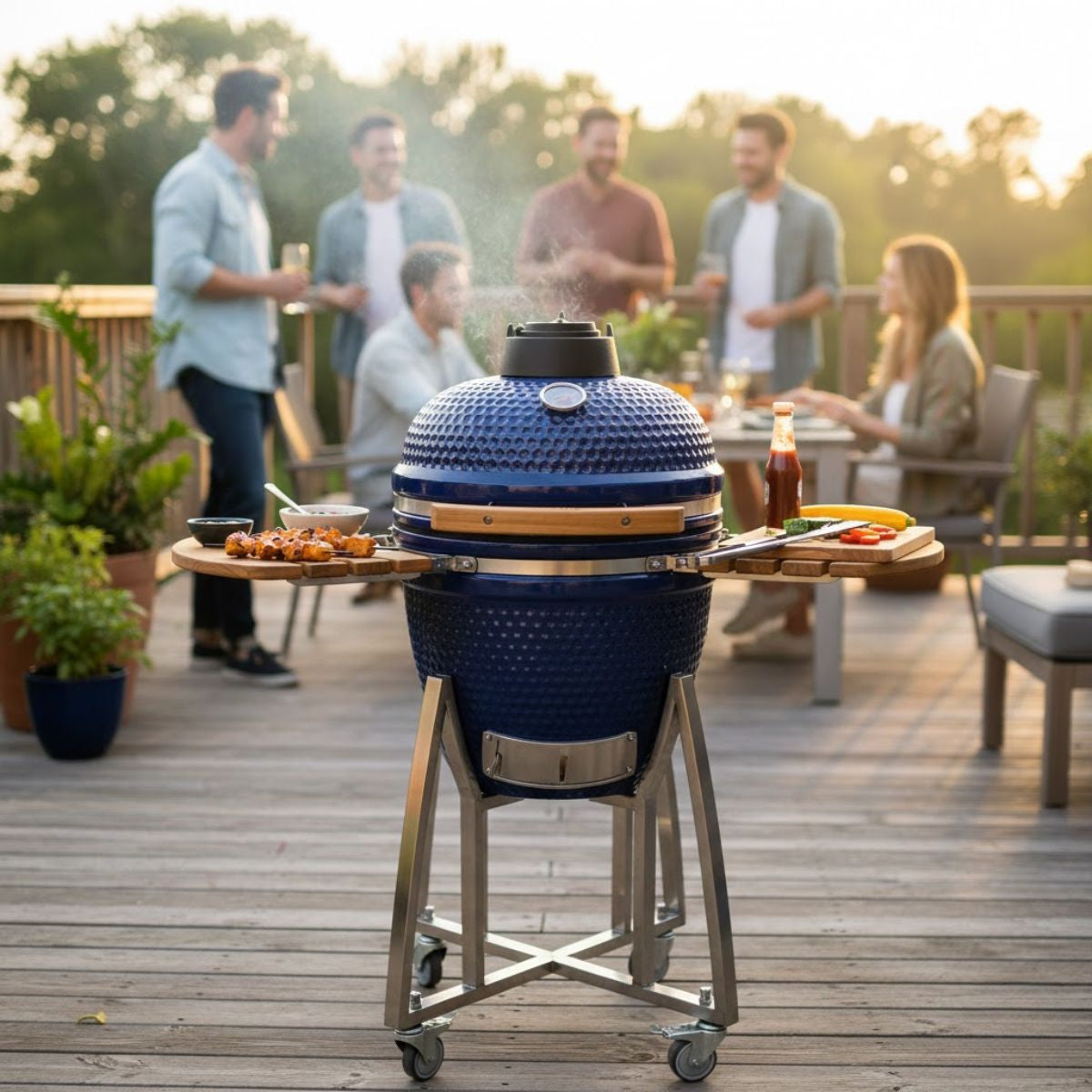 El Kamado de 23.5 pulgadas en acabado azul es el modelo de gran formato diseñado para quienes buscan la máxima capacidad y versatilidad en su cocina exterior. Su estructura de cerámica de alta densidad ofrece una retención térmica superior, permitiendo mantener temperaturas precisas durante horas para ahumados de larga duración o alcanzar el calor extremo necesario para pizzas a la leña. Gracias a su amplio diámetro, es ideal para preparar múltiples cortes simultáneamente o piezas de gran tamaño. El diseño icónico en color azul texturizado se combina con un carro de acero inoxidable de alta resistencia y estantes laterales de madera, ofreciendo una estación de asado completa, duradera y estéticamente impactante.