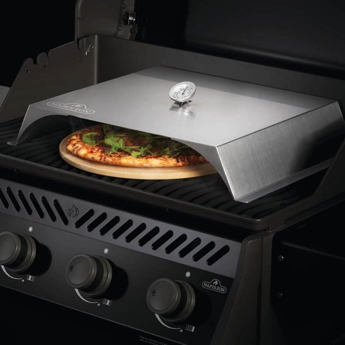 Transforme su parrilla de gas Napoleon en un horno de convección profesional con este complemento para pizza de acero inoxidable. Este accesorio inteligente está diseñado para crear un flujo de aire constante y calor envolvente, imitando las condiciones de un horno de leña tradicional. Al rodear la superficie de cocción, la cubierta retiene el calor superior necesario para derretir el queso y cocinar los ingredientes a la perfección, mientras que la piedra (se vende por separado) se encarga de la base crujiente. Gracias a su diseño cerrado con apertura frontal y el medidor de temperatura de precisión integrado, podrá hornear pizzas gourmet con resultados consistentes y esa textura artesanal que solo se logra con altas temperaturas controladas.