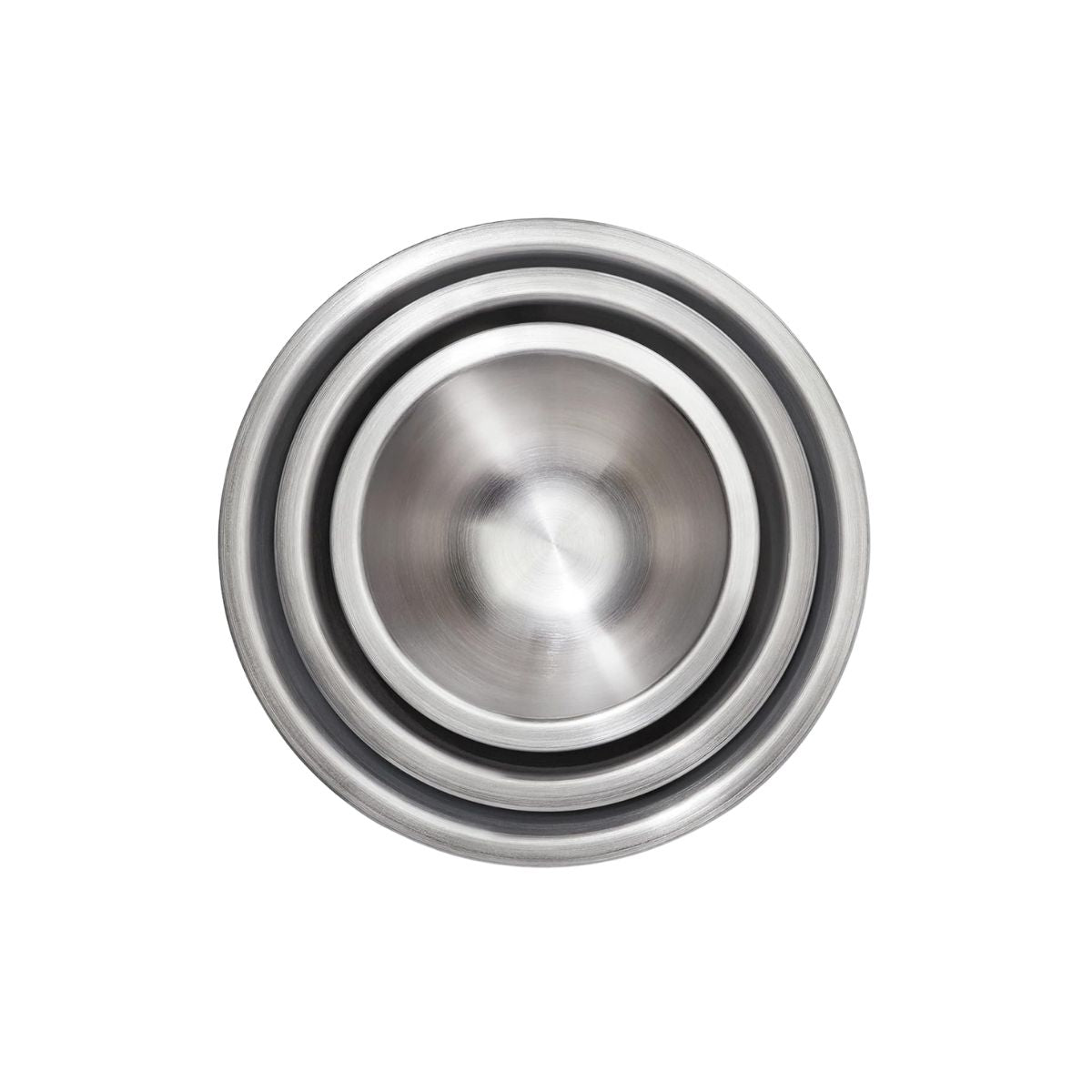 Este elegante y funcional juego de tres boles es un indispensable en cualquier cocina. El interior de acero inoxidable cepillado es perfecto para mantener la temperatura de los ingredientes, ya sean fríos o calientes, mientras que el exterior de plástico aísla tus manos. Cuentan con una base antideslizante que les da estabilidad mientras mezclas, incluso en ángulo. Los boles se anidan para un almacenamiento compacto y son ideales para batir, marinar o servir.El juego incluye:1 Bol pequeño: 1.4 L (1.5 qt) de capacidad.1 Bol mediano: 2.8 L (3 qt) de capacidad.1 Bol grande: 4.7 L (5 qt) de capacidad.