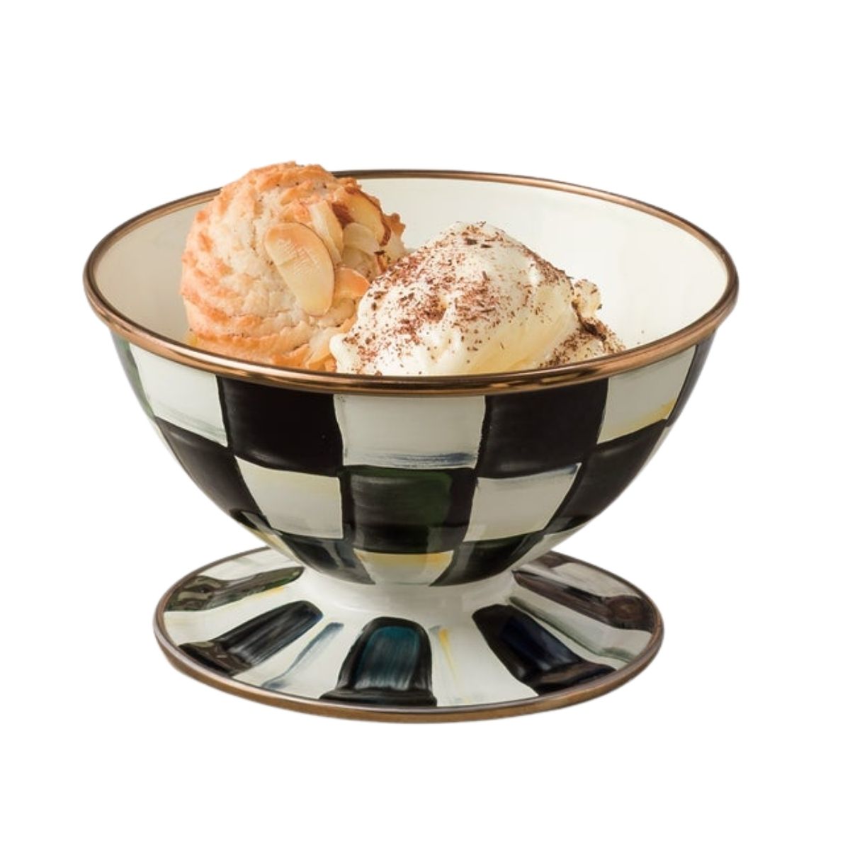 Disfruta cada postre con encanto: este cuenco para helado esmaltado con pedestal presenta el icónico estampado Courtly Check en blanco y negro pintado a mano, combinado con ribetes metálicos dorados, para una experiencia visual refinada incluso en los pequeños placeres.