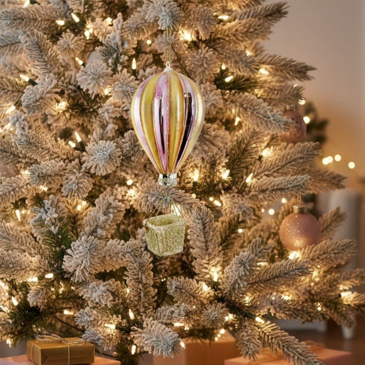 Añada un toque de ensueño y elegancia a su árbol de Navidad con este adorno colgante de globo aerostático. Fabricado en cristal soplado, presenta un hermoso diseño de rayas brillantes en rosa y oro, acentuado con líneas de purpurina (glitter) dorada. La cesta, también cubierta de purpurina dorada, cuelga delicadamente, completando esta pieza de 14 cm.