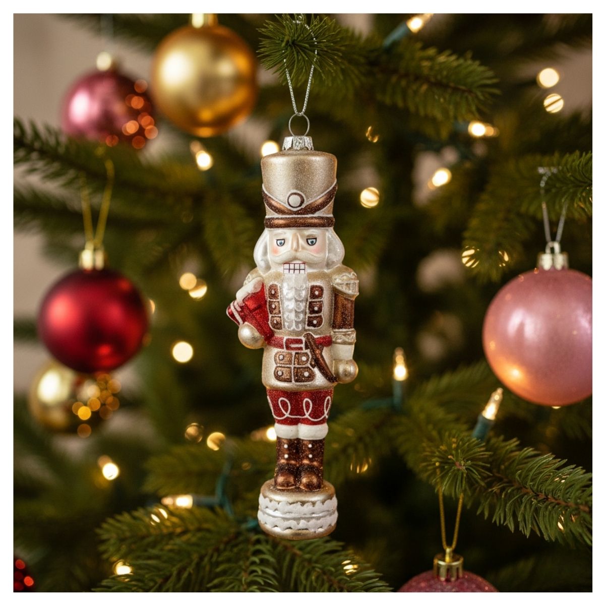 Este adorno de cascanueces de vidrio aporta un toque de elegancia rústica y sofisticada a tu árbol de Navidad. Su acabado en un tono marrón mate le da un aspecto distintivo y moderno, alejándose de los colores tradicionales sin perder el encanto clásico de la figura. Con 18 cm de altura, esta pieza artesanal de vidrio soplado es un detalle de buen gusto que complementará a la perfección decoraciones de estilo natural, nórdico o contemporáneo.Características: -Diseño clásico de la figura del cascanueces en un adorno de vidrio soplado- Acabado en un elegante y original color marrón con una textura mate- Con una altura de 18 cm, es una pieza con una presencia notable y refinada- Incluye un colgante para una fácil y segura colocación en el árbol.
