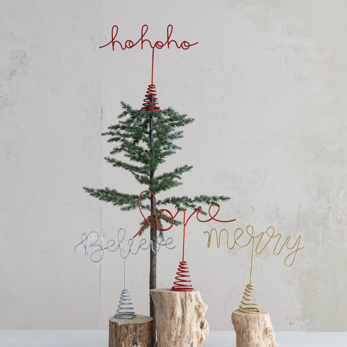 Corona tu árbol de Navidad con una expresión de pura alegría festiva. Esta punta de árbol de metal presenta las palabras "Ho Ho Ho" en una tipografía alegre, cubierta con un acabado de brillantina roja que captura la luz y añade un brillo espectacular. Con una altura de casi 25 cm, es el toque final perfecto para cualquier árbol, proclamando la llegada de la temporada con un estilo divertido y caprichoso.