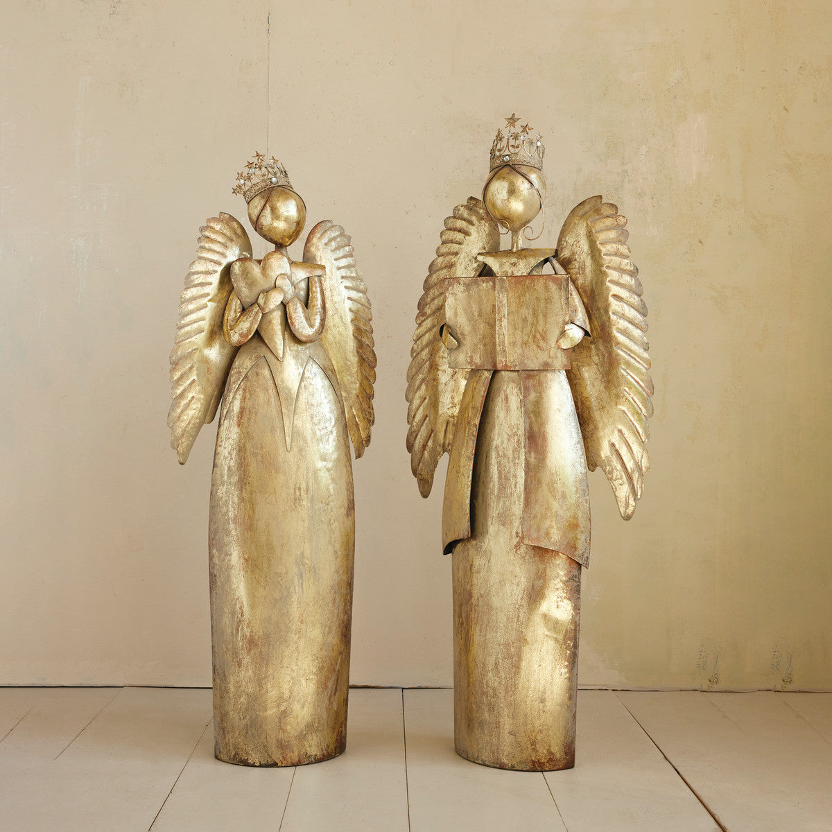 Una pieza de decoración verdaderamente celestial y de gran escala. Este ángel de metal, con una asombrosa altura de 141 cm, sostiene un libro y está adornado con una corona de estrellas y joyas acrílicas, todo con un hermoso acabado en oro envejecido. Su presencia imponente y sus detalles artísticos la convierten en una declaración de fe y belleza, ideal para ser el centro de tu decoración navideña en la entrada, un gran salón o junto a la chimenea. Sus medidas son 59 cm de largo por 21 cm de ancho.