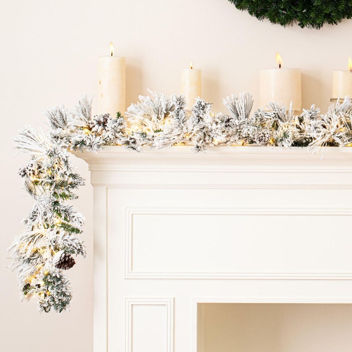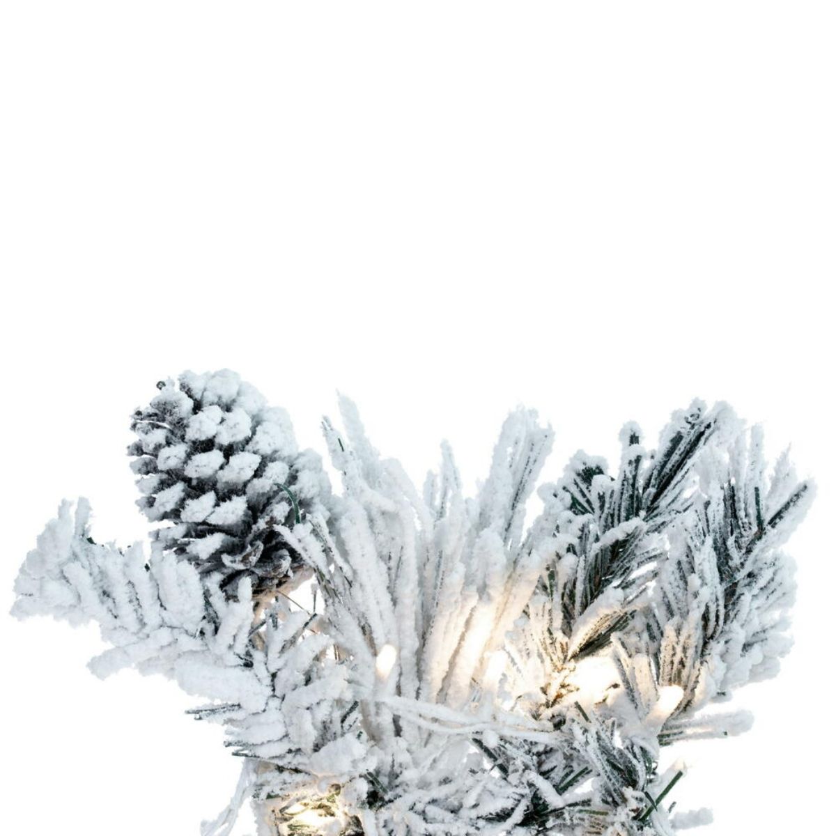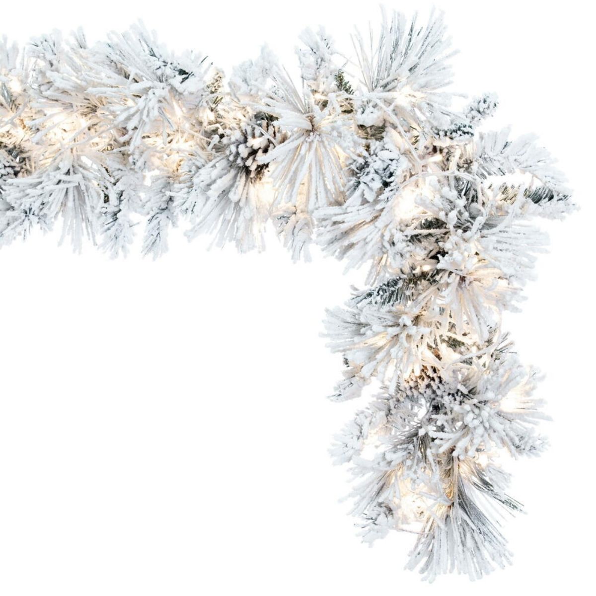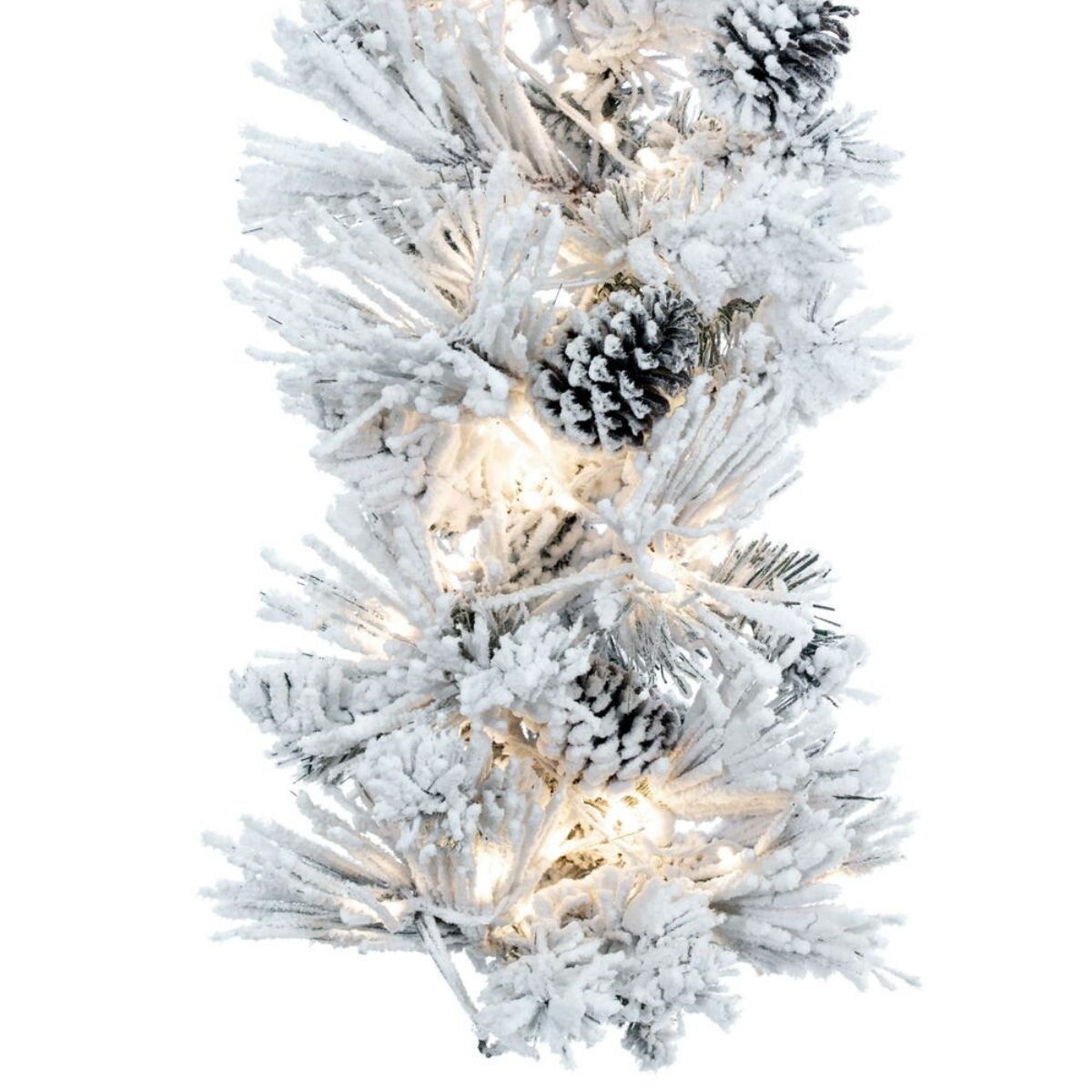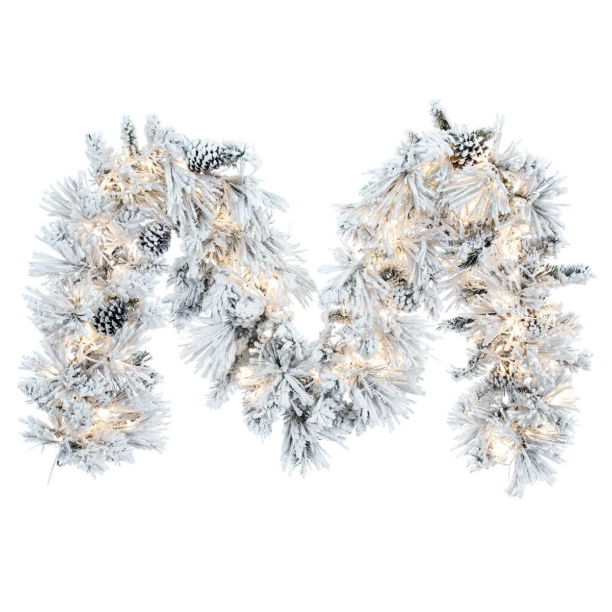 Guirnalda de Navidad Artificial Vickerman 9' x 14" Flocked Atka Con 165 puntas de PVC/Hardneedle, piñas y 200 luces LED de Bajo Voltaje Blanco Cálido Gran Angular de 3mm. Envuelve la barandilla con esta guirnalda escarchada o colócala sobre la chimenea para conseguir un aspecto navideño pulido. Esta brillante guirnalda viene preiluminada con luces LED de bajo voltaje y gran angular de color blanco cálido que funcionan con 120 V CA, y presenta una bonita mezcla flocada de puntas de PVC y Hardneedle con detalles realistas de piñas. La columna flexible con cable asegura que esta guirnalda satisfará todas sus necesidades de decoración.