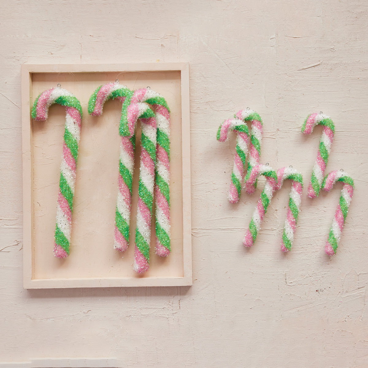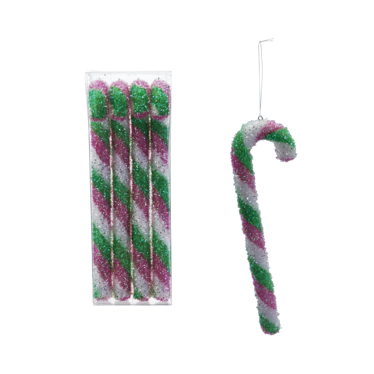 Dale un toque clásico y festivo a tu árbol de Navidad con este icónico set de adornos. El juego incluye cuatro bastones de caramelo, cada uno acentuado con oropel brillante que captura la luz y añade un destello especial a tu decoración. Su diseño ligero los hace perfectos para cualquier rama. Cada adorno mide 30 cm de largo.