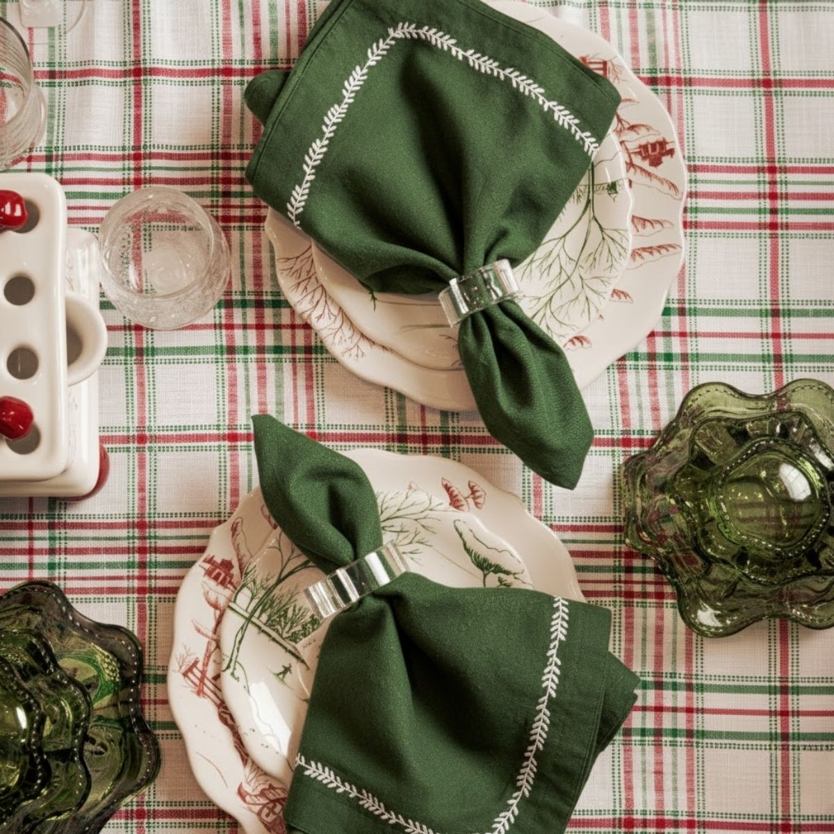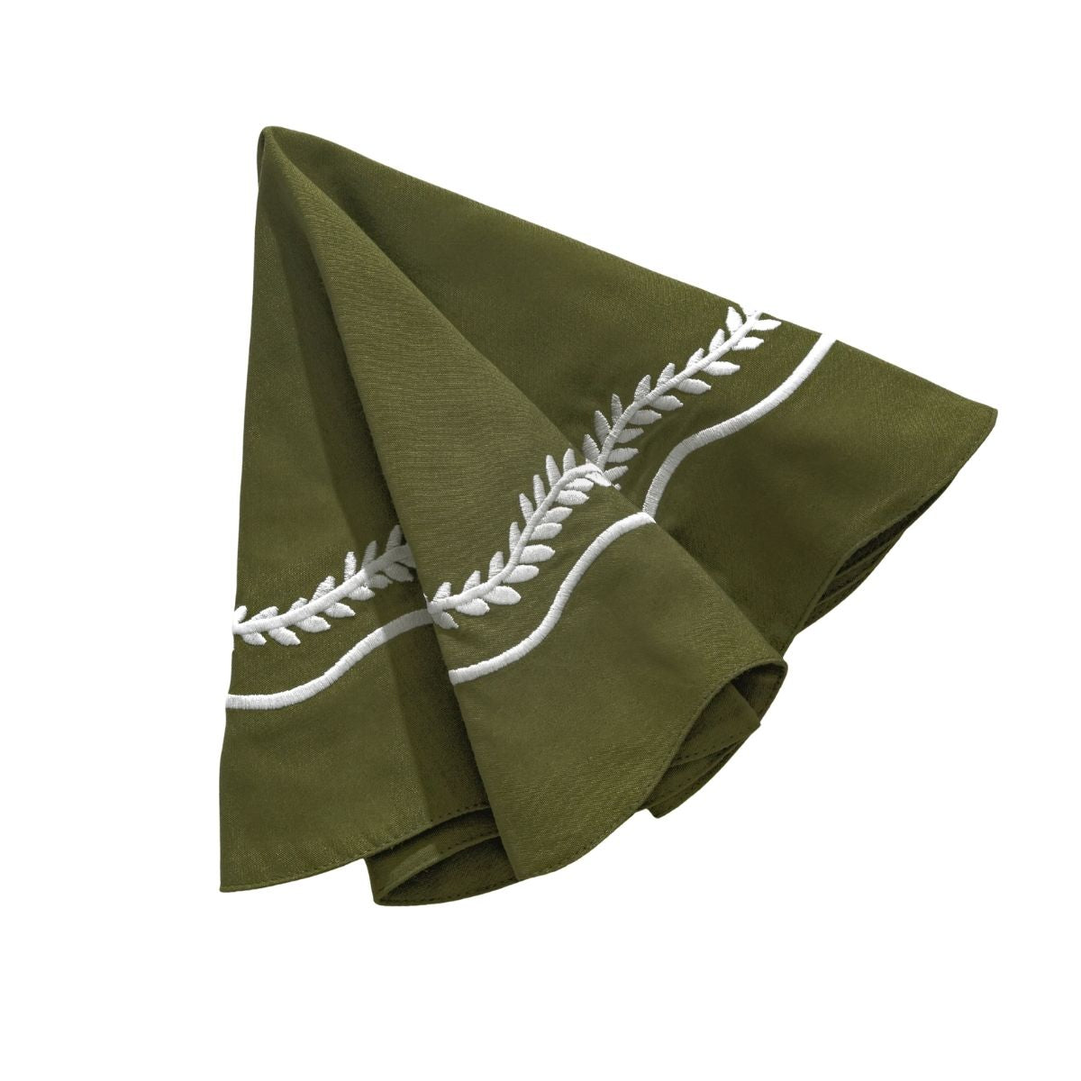 Añada un toque de alta costura a su mesa festiva con este set de 4 servilletas de la "Christmas Collection". Confeccionadas en tela de alta calidad en un sofisticado tono verde oliva, cada servilleta de 55x55 cm está realzada con un elegante bordado blanco. El diseño presenta un borde curvo con un delicado patrón de hojas, creando un look refinado y único.