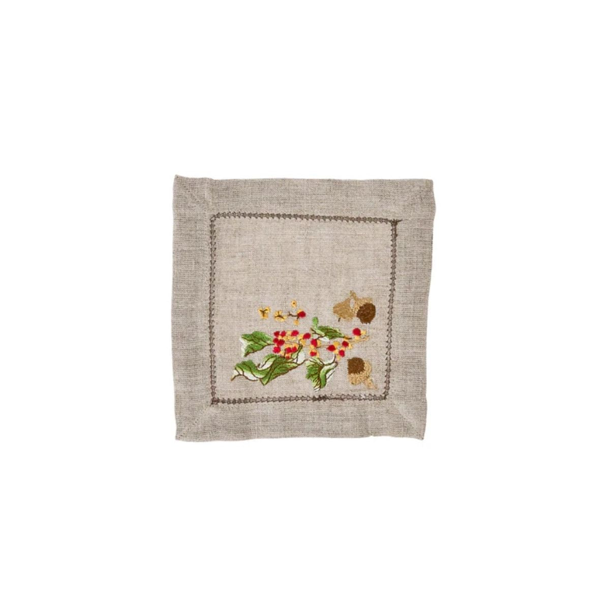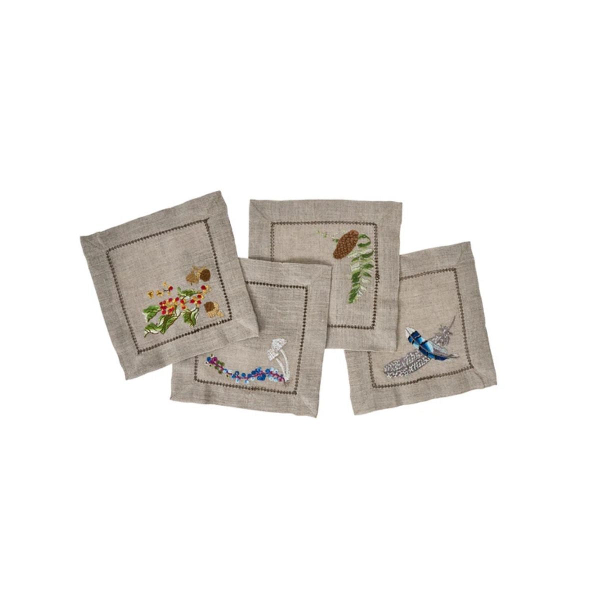 Champiñones, bellotas, plumas y helechos del bosque están intrincadamente bordados a mano en este encantador juego de servilletas de cóctel de lino clásico. Diseñadas para dar un toque final a la hora del cóctel, querrás usarlas durante toda la temporada (¡y son un regalo fabuloso!). Sus dimensiones son 15.24 cm de largo y 15.24 cm de ancho.