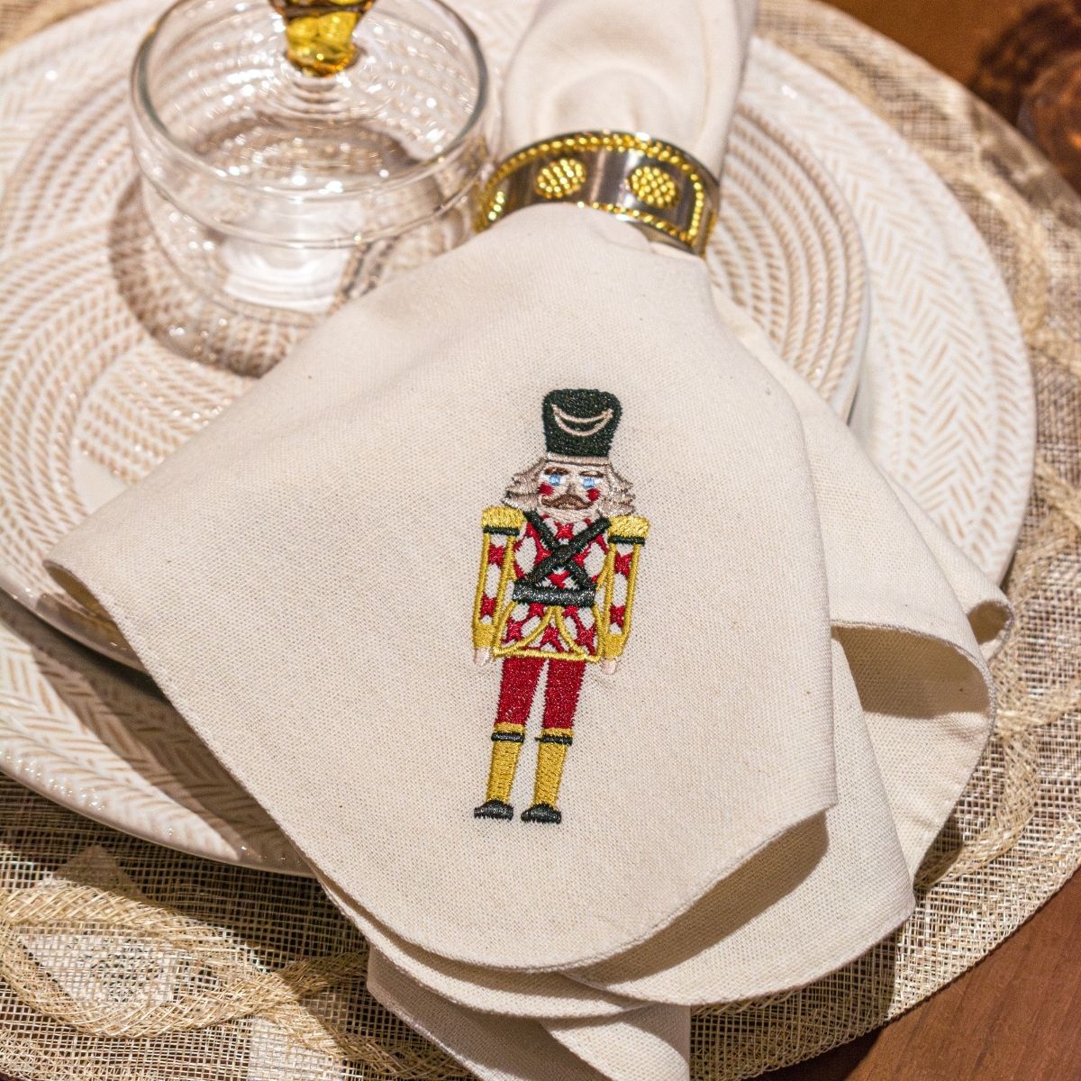 - Cada servilleta presenta un bordado de cascanueces diferente.