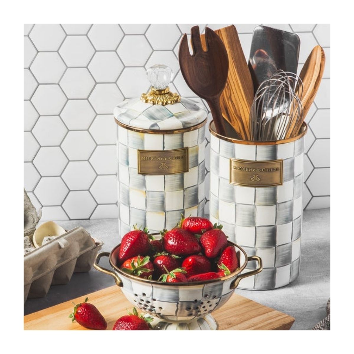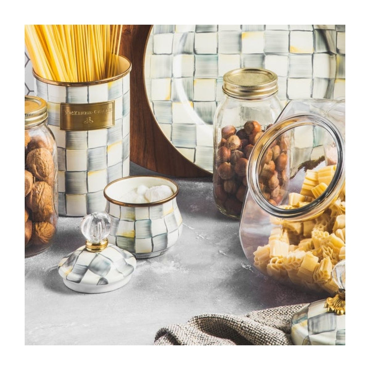 Un canister elegante y espacioso que combina funcionalidad y diseño. Con el delicado patrón Sterling Check pintado a mano en tonos grises, y remates en acero inoxidable bronceado con perilla de vidrio, esta pieza es ideal para almacenar ingredientes con estilo y presencia visual.