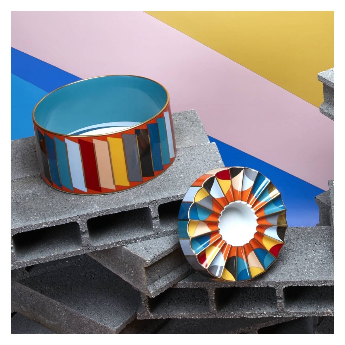 Su diseño se caracteriza por colores vibrantes y contrastantes, así como por formas geométricas dinámicas que incluyen líneas oblicuas, círculos y ángulos divergentes, todo ello realzado con lujosos detalles en oro. Es un accesorio funcional y elegante, ideal para organizar objetos personales con un toque de arte de vanguardia. Sus dimensiones son 25 cm de diámetro y 5.4 cm de alto.