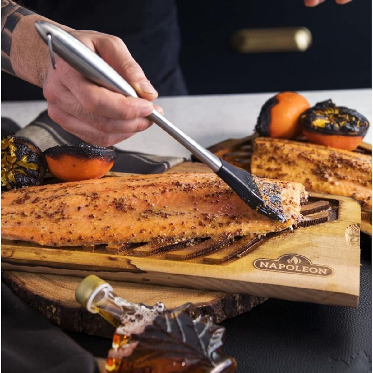 El pincel para hilvanar PRO de Napoleon es la herramienta definitiva para los entusiastas de la parrilla que buscan precisión, higiene y estilo. Diseñado con un mango ergonómico de acero inoxidable de alta calidad, este pincel ofrece un equilibrio perfecto y mantiene las manos a una distancia segura del calor. Su cabezal de silicona de grado alimenticio es ideal para distribuir salsas, marinadas y mantequillas de manera uniforme sin absorber olores ni desprender cerdas sobre los alimentos, superando ampliamente a las brochas tradicionales de algodón o pelo. Con un diseño sofisticado y materiales de grado profesional, este accesorio no solo eleva la estética de tu estación de parrilla, sino que garantiza una limpieza total gracias a su compatibilidad con el lavavajillas.