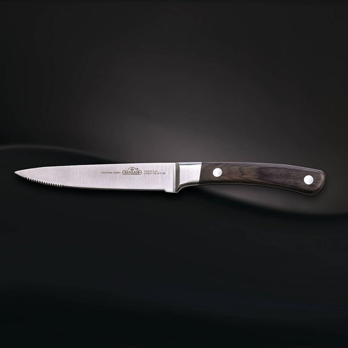 El cuchillo para filete de la serie PRO de Napoleon redefine la experiencia de disfrutar un buen corte de carne, combinando una estética clásica con una funcionalidad de vanguardia. Su hoja de 12 cm está fabricada en acero inoxidable de alto carbono, lo que garantiza una retención de filo excepcional y una resistencia superior a la corrosión. Este cuchillo presenta un diseño de doble filo híbrido: una sección dentada para un agarre inicial preciso y una sección de borde recto para un corte suave y limpio que respeta las fibras de la carne. El mango de madera de palisandro pulido no solo aporta una elegancia atemporal a la mesa, sino que ofrece una ergonomía cálida y suave al tacto, perfectamente equilibrada gracias a su construcción de espiga completa (full tang).