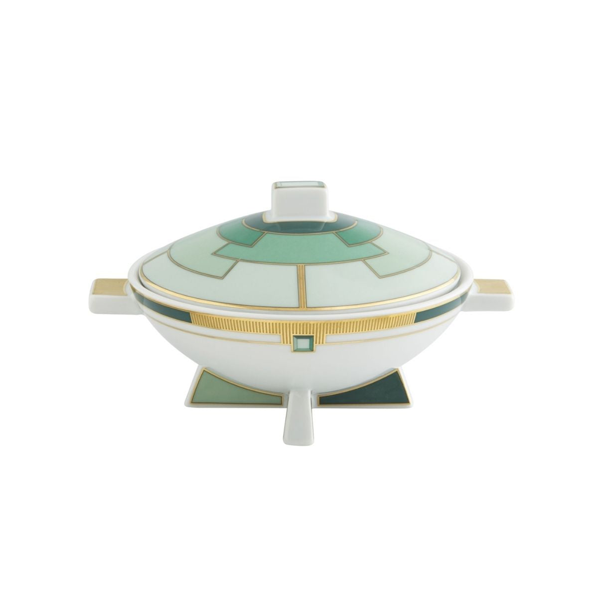 Inspirada en la opulencia y la geometrización del Art Déco, esta azucarera de la colección Emerald es una pieza que evoca la exuberancia de los años 30 con un toque de modernidad. Ricamente decorada con oro mate y verdes oscuros, esta pieza de porcelana es un testimonio de la artesanía y el diseño sofisticado.