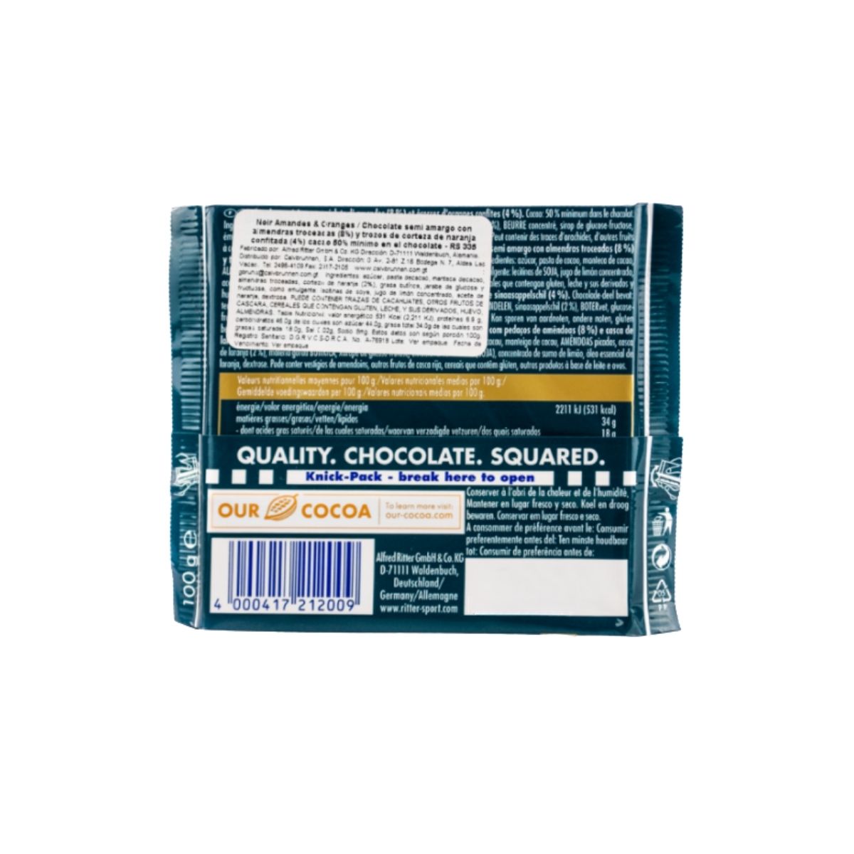 Una combinación irresistiblemente deliciosa te espera en la tableta de chocolate amargo con almendras y naranja de Ritter Sport. Cada uno de sus cuadros contiene crujientes trozos de almendras de California tostadas y dulces pedacitos de cáscara de naranja, todo envuelto en un intenso y equilibrado chocolate amargo con 50% de cacao de origen sostenible. Esta barra contiene 100 gramos (gr).